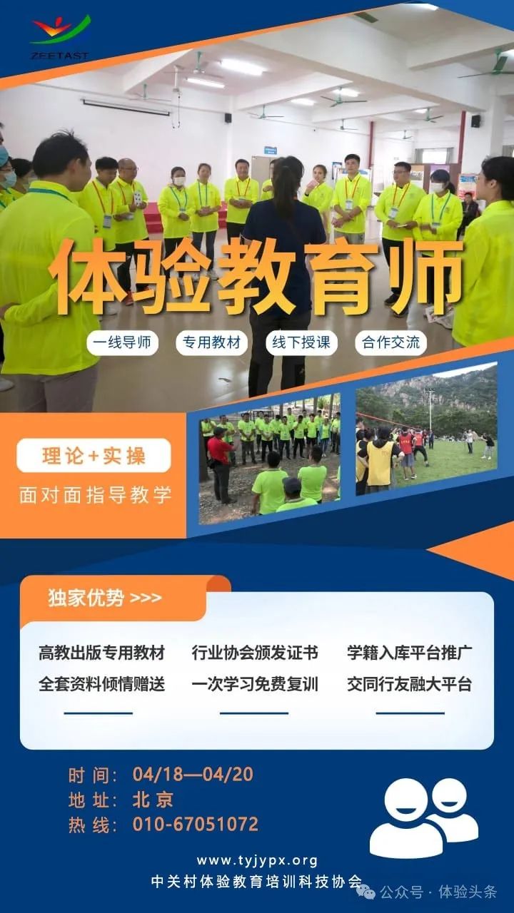 当春暖花开遇上企业团建旺季,您是否准备好迎接各类客户需要。✅ 高空:高空拓展项目实操体验教学;✅ 地面:场景模拟互动、企业团建场景实训,掌握 "问题设计 - 活动执行 - 效果评估" 全流程;✅ 安全:高空设备操作、急救技能等硬核技能训练,保障教学安全底线; 3 天体验教育师速成班帮您破解困局! 结业考证:中体培协《体验教育师》认证,全国通用 终身复训权:免费参加同等级别课程更新,紧跟行业趋势 特别提醒:本次培训名额有限,报满即止!